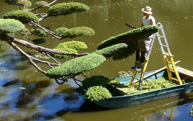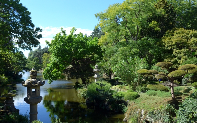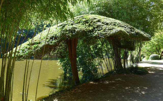 Jardin à l’anglaise dessiné autour d’un ancien moulin médiéval, et de trois étangs, réunissant 8 hectares de parc aux airs de Louisiane. L’enchevêtrement des espèces indigènes et importées (2500 essences) produit une impression de dépaysement total. Vignoble et collection de bambous. La floraison des glycines y est spectaculaire.